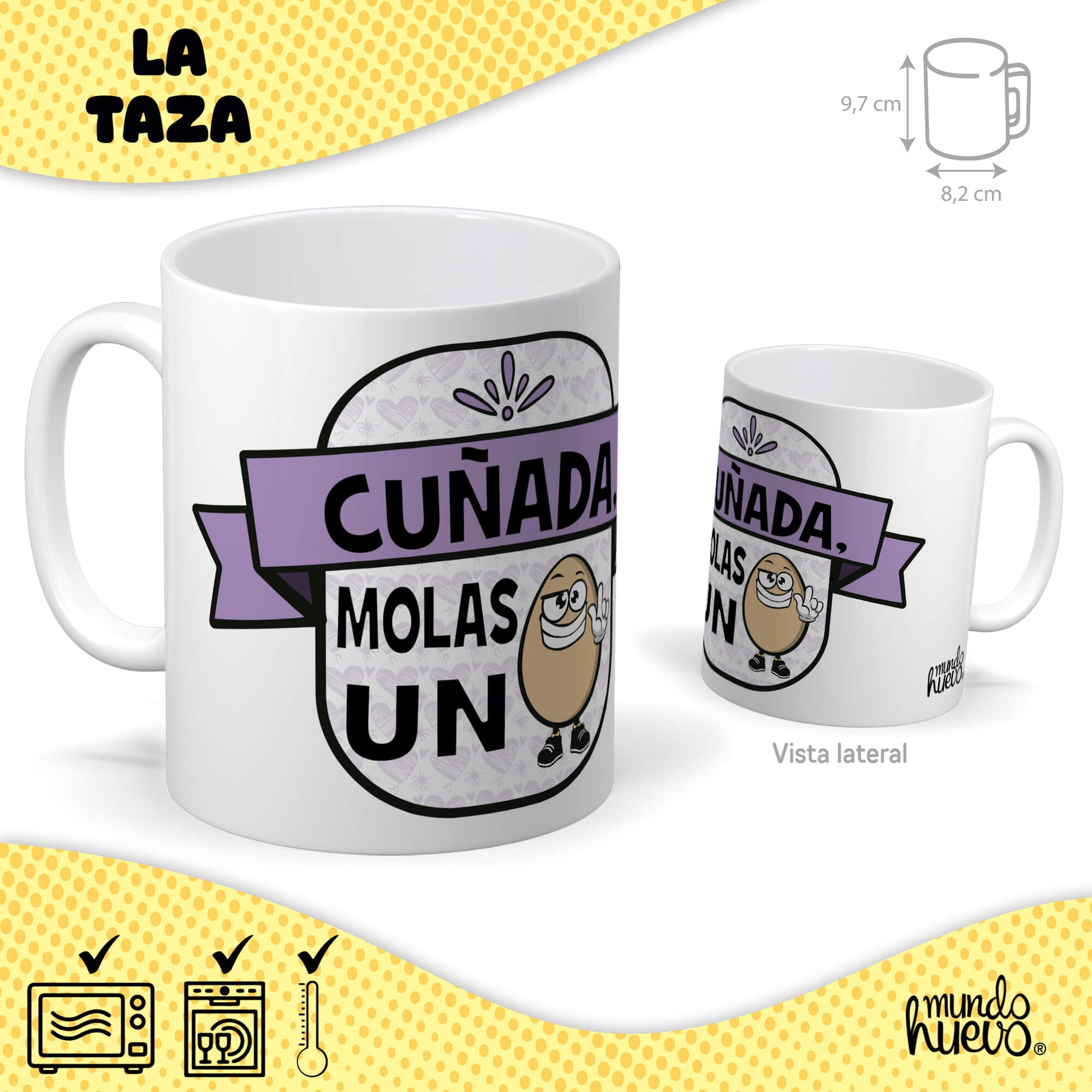 Taza Cuñada molas un huevo + Caramelos divertidos + Pulsera sorpresa